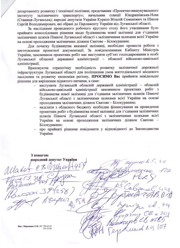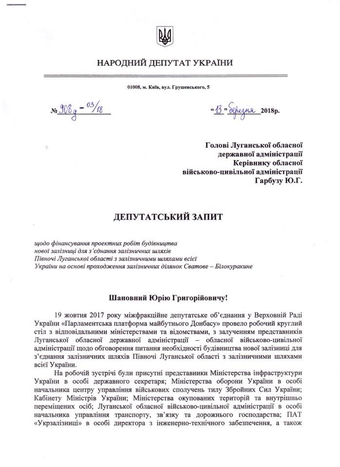 Ініціював колективне звернення від Народних депутатів України до голови Луганської ВЦА Юрія Гарбуза.
