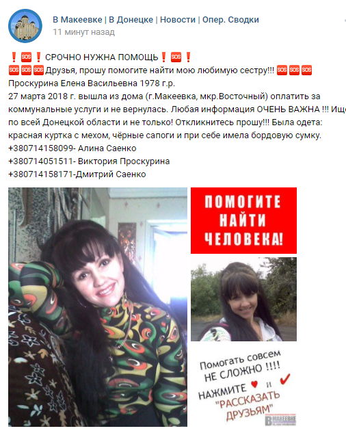 Так, на минувшей неделе в Макеевке пропала местная жительница Проскурина Елена Васильевна 1978 года рождения.