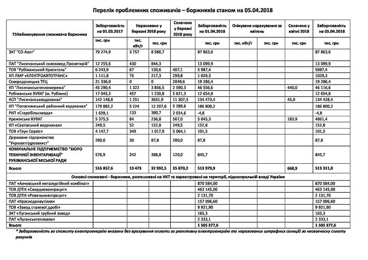 Перечень проблемных потребителей - должников за электроэнергию в Луганской области по состоянию на сегодня, 5 апреля, а также их уровень потребления и оплаты был опубликован на странице ЛЭО в Facebook