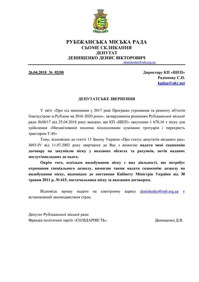 В связи с этим депутат Рубежанского городского совета Денис Денищенко решил запросить эту информацию непосредственно у руководства коммунального предприятия, чтобы убедиться:
