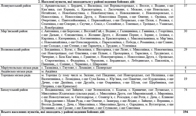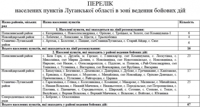 На своей странице в Facebook волонтер Роман Доник опубликовал перечень населенных пунктов Луганской и Донецкой области, которые входят в зоне боевых действий согласно новым правилам в связи с началом проведения Операции объединенных сил (ООС):