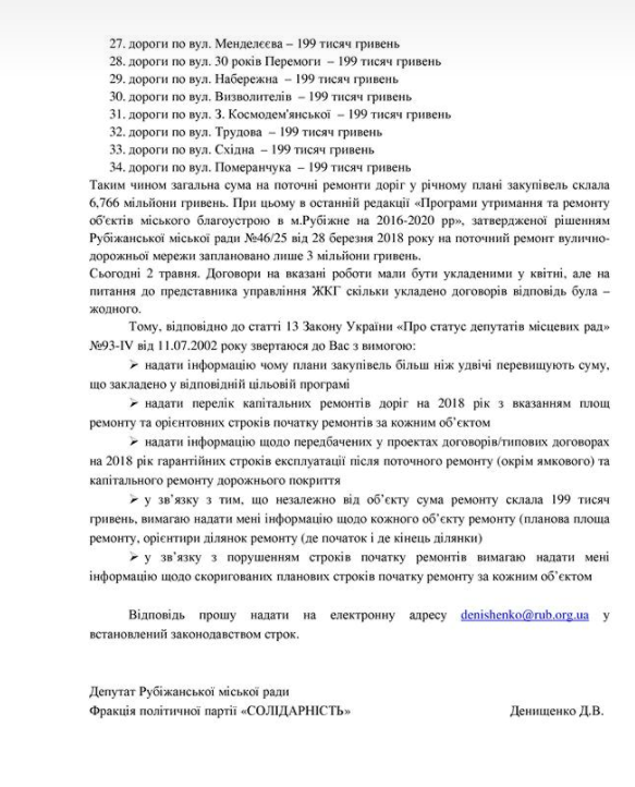 - в связи с тем, что независимо от объекта сумма ремонта составила 199 000 гривен, требует предоставить ему информацию по каждому объекту ремонта (плановая площадь ремонта, ориентиры участков ремонта (где начало и где конец участка);