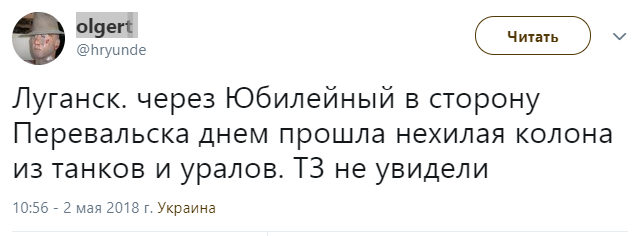 Так, пользователь olgert пишет в Twitter, что большая колона из танков и "Уралов" прошла через поселок Юбилейный в сторону Перевальска.