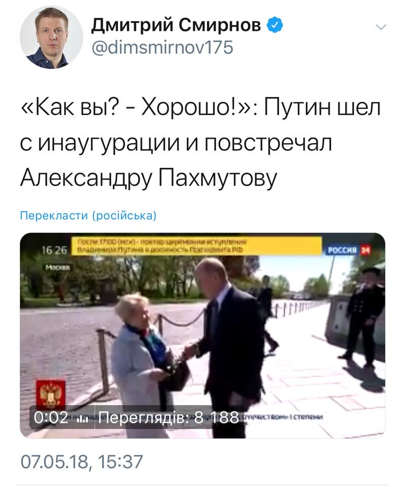 Неожиданно для многих в Интернете было размещено видео, как идущий с инаугурации Путин "совершенно случайно" встречает российского композитора Александру Пахметову, чей рост странным образом позволяет Путину выглядеть на ее фоне очень выгодно.