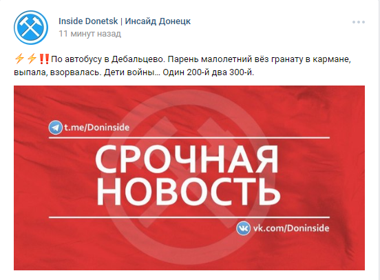 "По автобусу в Дебальцево. Парень малолетний вёз гранату в кармане, выпала, взорвалась. Дети войны… Один 200-й два 300-й", - сказано в сообщении.