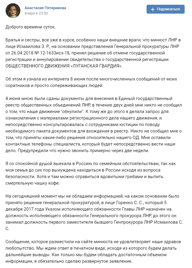 "Минюст ЛНР" на основании представления "генпрокуратуры ЛНР" принял решение об отмене "государственной регистрации" и аннулировании свидетельства "о государственной регистрации" т.н. общественного движения "Луганская гвардия", а его лидер Анастасия Пятерикова покинула оккупированный Луганск.