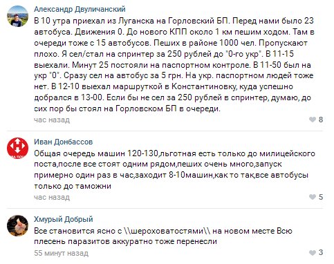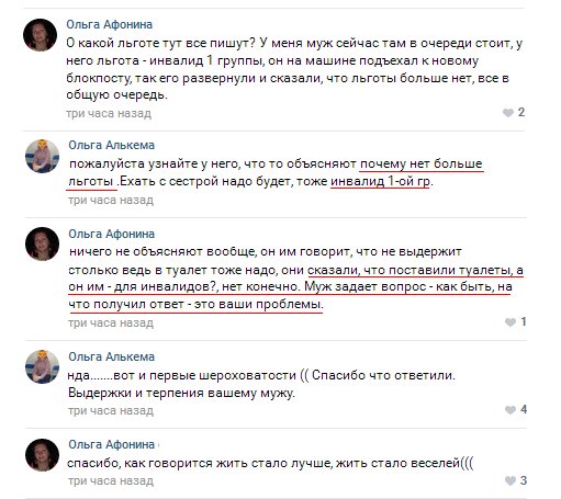 "О какой льготе тут все пишут? У меня муж сейчас там в очереди стоит, у него льгота — инвалид 1 группы, он на машине подъехал к новому блокпосту, так его развернули и сказали, что льготы больше нет, все в общую очередь", — пишет местная жительница.