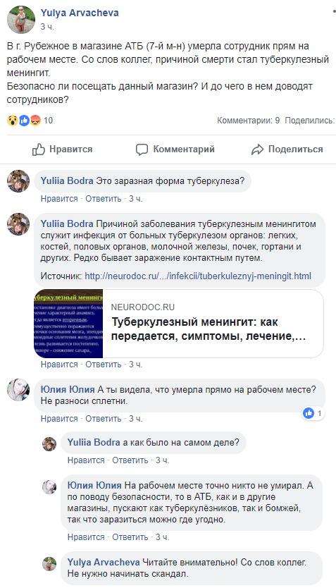 Появившаяся в сети информация о том, что в одном из супермаркетов "АТБ" города Рубежное сотрудница умерла на рабочем месте не соответствует действительности.