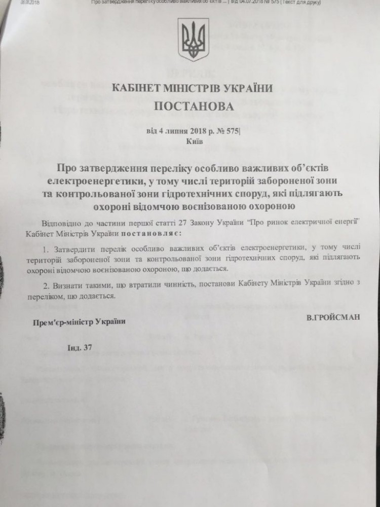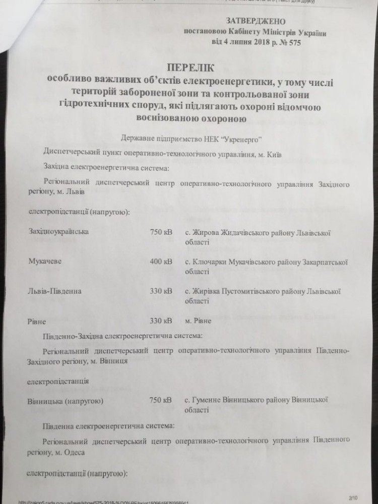 Речь идёт о постановлении Кабмина «Об утверждении перечня особо важных объектов электроэнергетики, подлежащих охране ведомственной военизированной охраной».