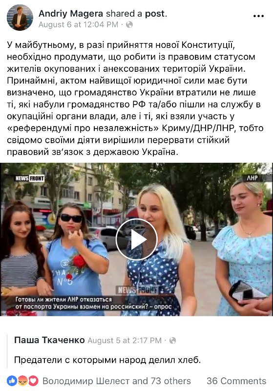 Изначально Магера опубликовал пост на своей странице в Фейсбуке, где разместил сюжет крымского пропагандистского ресурса «NewsFront» - в видео у жителей Луганска спрашивают, готовы ли они отказаться от паспорта Украины в замен на российский. Магера заявил, что в случае принятия новой Конституции Украины он выступает за введение нормы, позволяющей лишать украинского гражданства не только тех, кто пошёл на сотрудничество с оккупантами, но и участвовал в «референдумах за независимость Крыма/Д-ЛНР».
