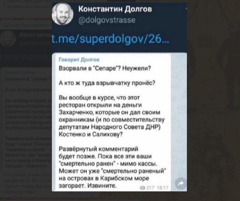 "Взорвали в "Сепаре"? Неужели? А кто ж туда взрывчатку пронес? Вы вообще в курсе, что этот ресторан открыли на деньги Захарченко, которые он дал своим охранникам ( и по совместительству депутатам Народного Совета ДНР) Костенко и Салихову? Развернутый комментарий будет позже. Пока все эти ваши "смертельно ранен" - мимо кассы. Может он уже "смертельно раненый" на островах в Карибском море загорает. Извините.", - написал Долгов.