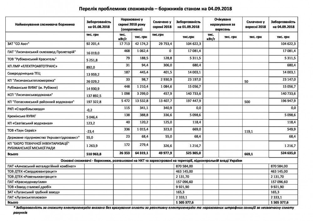 ООО «Луганское энергетическое объединение» опубликовало на своей странице Facebook список проблемных должников Луганской области на 4 сентября.