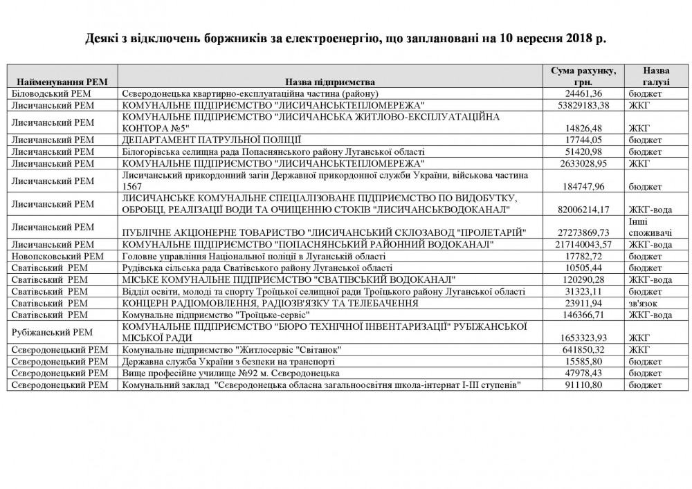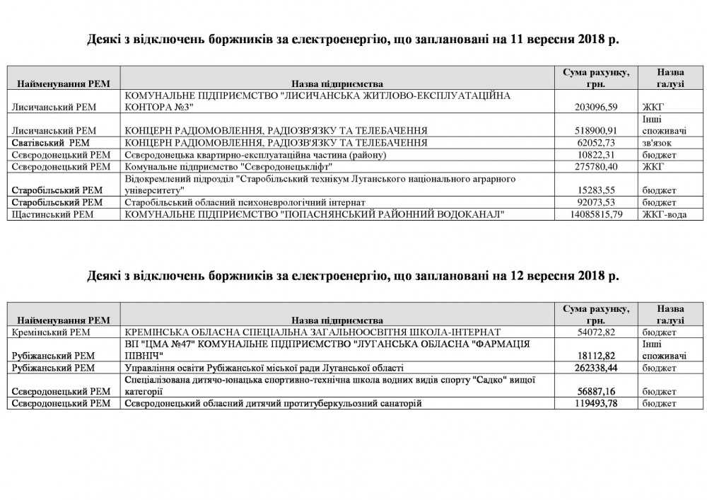 Луганское энергетическое объединение обнародовало расширенный перечень предприятий и организаций, имеющих значительные долги за потребленную электроэнергию, из-за чего могут быть отключены от электроснабжения в течение 10-12 сентября текущего года.