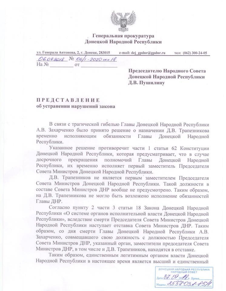 Так называемая "генеральная прокуратура ДНР" признала незаконным назначение Дмитрия Трапезникова исполняющим обязанности "главы ДНР".