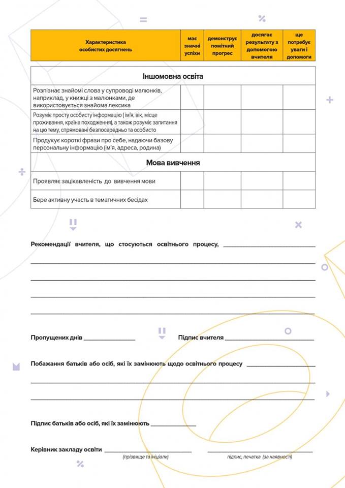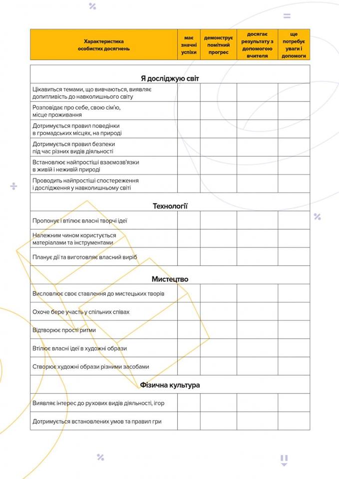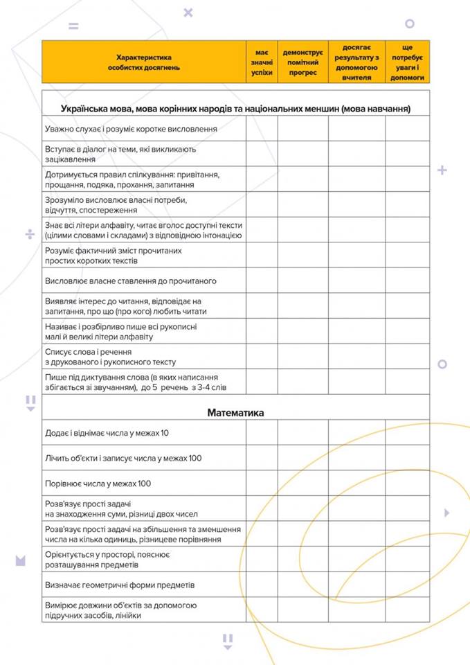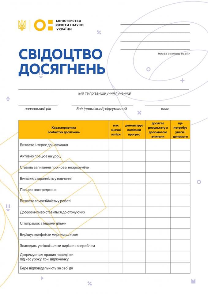 Министерство образования и науки Украины ввело новую систему оценивания результатов обучения первоклассников. Для того чтобы родители были проинформированы о результатах учебы своих детей, разработано свидетельство оценивания достижений, вместо табелей. Это свидетельство включает в себя 51 показатель., среди которых есть такие, как умения брать на себя ответственность или умение сотрудничать с другими, решать конфликты, вместе с тем есть такие показатели, как умение писать диктанты и умение считать в пределах ста.