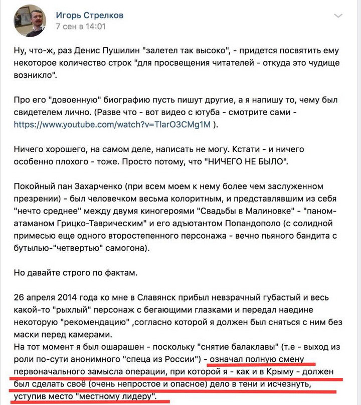 Бывший главарь боевиков на Донбассе Игорь Гиркин очередной раз признал свою главную роль в начале конфликта на востоке Украины и раскрыл русские планы из дестабилизации Украины. Журналист изложил скриншот сообщение Гиркина (Стрелкова) в одной из соцсетей, в котором экс-главарь «ДНР» поделился воспоминаниями о событиях на Донбассе в 2014 году в связи с назначением на должность «руководителя республики» Дениса Пушилина после ликвидации Александра Захарченка.