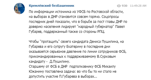 Так, по данным источника, старшему от ФСБ в "ДНР" полковнику ФСБ Михаилу Южанину поставлена задача во что бы то ни стало не допустить участие Губарева в "выборах".