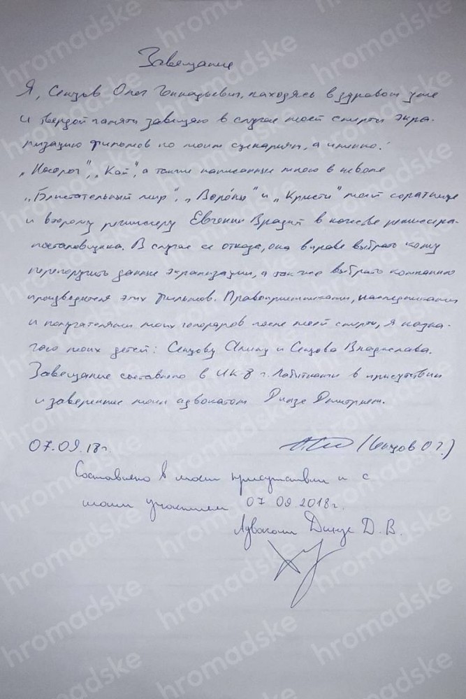 Об этом сообщает hromadske.ua, которому передала завещание сестра Сенцова – Наталья Каплан.