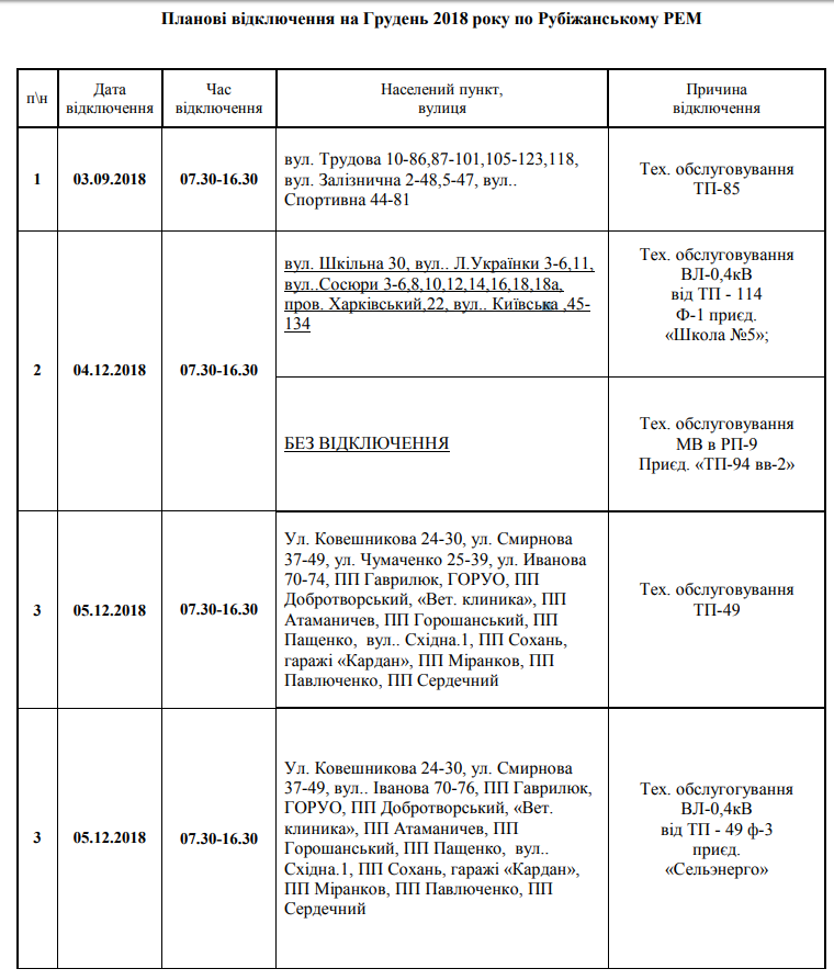 На официальном сайте Рубежанского городского совета опубликовали график плановых отключений электроэнергии на декабрь 2018 года.