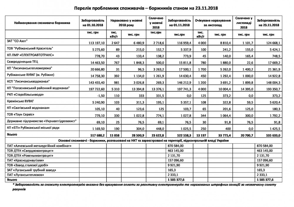 "Луганское энергетическое объединение" опубликовало список проблемных должников Луганщины на 23 ноября.