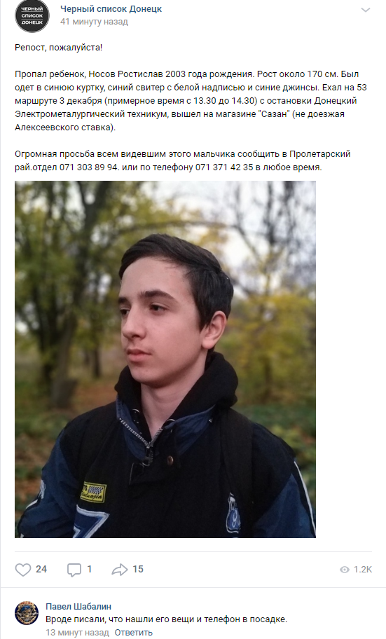 Ростислав Носов 2003 года рождения пропал в понедельник, 3 декабря.