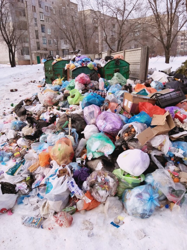 После новогодних праздников мусорные контейнеры в оккупированном Алчевске переполнены, на некоторых улицах отходы начали складывать на пешеходных зонах.