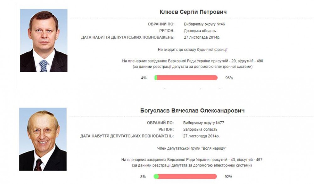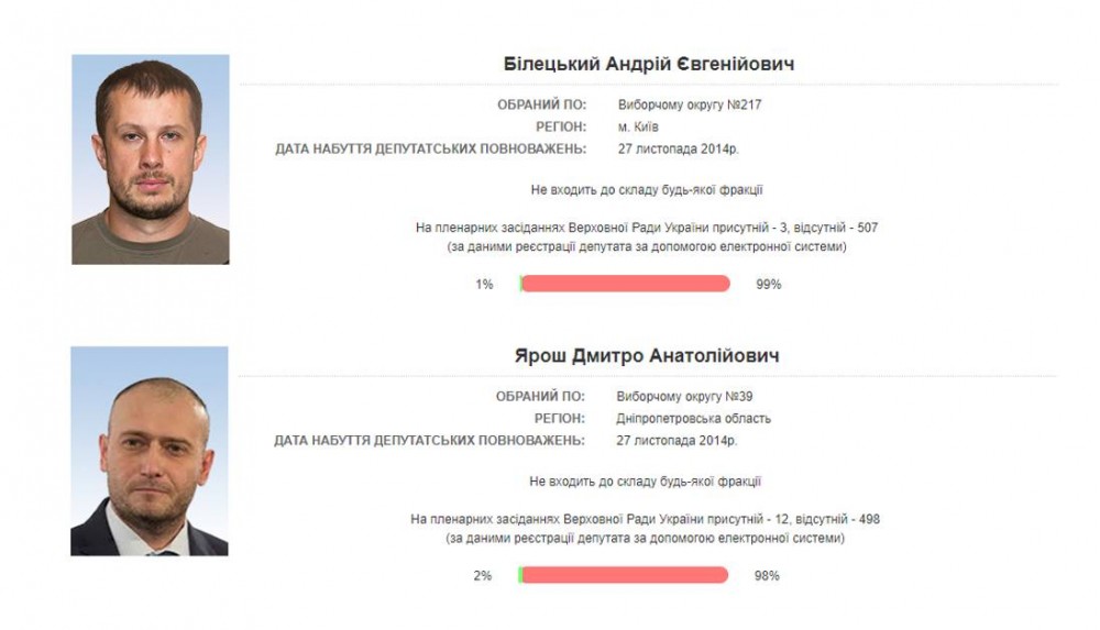 Воспетые до небес бравые патриоты, как видим, абсолютно не оправдали оказанного им доверия и вместо законотворчества, использовали мандат сугубо в личных целях. Печальный топ таких депутатов, возглавляют народные избранники Андрей Билецкий и Дмитрий Ярош, которые занимались чем угодно, кроме своей непосредственной работы - их явка составляет 1 и 2 процента заседаний, соответственно. Не отстают в этом рейтинге и борцы за справедливость от противоположного лагеря, а именно знаменитый Сергей Клюев с 4% явки и Вячеслав Богуслаев от "Воли народу" с явкой 8%.
