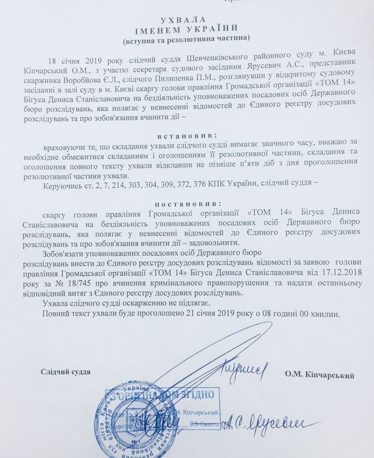 Теперь, согласно решению суда, ГБР должно внестии данные о правонарушении в Единый реестр досудебных расследований и предоставить оттуда выписку.