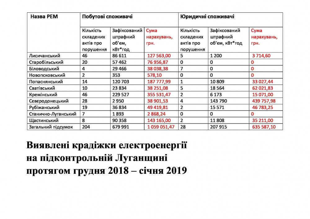 За период с декабря 2018 по январь 2019 на подконтрольной территории Луганщины персоналом энергосбыта в количестве 29 рейдовых бригад и энергоинспекцией было выявлено 204 случая хищений электрической энергии бытовыми потребителями и 28 случаев хищений юридическими лицами (предприятиями), - сообщает пресс-служба ЛЭО.