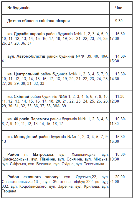 Как сообщает пресс-служба горсовета, для решения вопроса обеспечения питьевой водой населения указанных районов ЛКСП разработан следующий график подвоза воды.