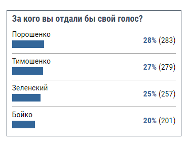 Стоит отметить, что в течении недели голоса за Юлию Тимошенко накручивались трижды, что позволяло ей выходить на первое место. Без накрученных голосов Тимошенко оказалась лишь третьей. Впрочем, на этом голосование не заканчивается. Мы разместили свежий опрос (правый верхний угол сайта), оставив в нем тройку лидеров: Порошенко, Зеленского и Тимошенко.
