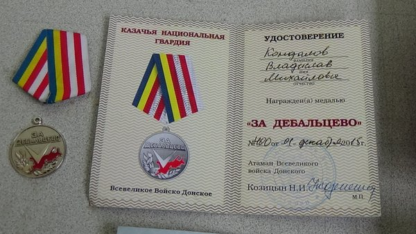 Медаль Кондалова «За Дебальцево» (№ 400 от 1 декабря 2015 г.)