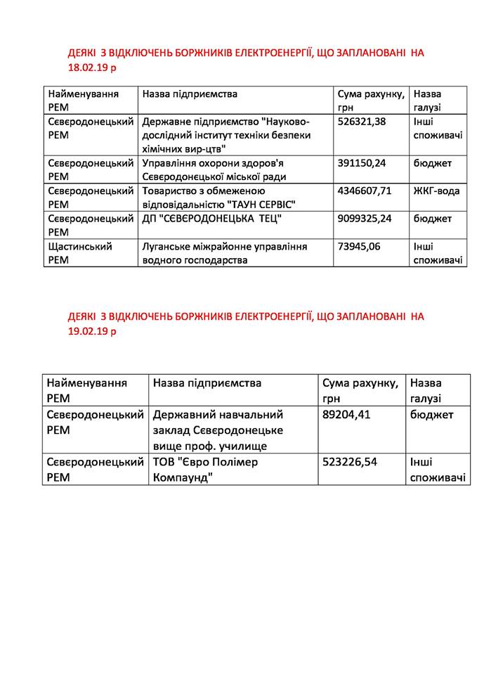 Так, 18 и 19 февраля предприятия Северодонецка рискуют остаться без электроснабжения из-за долгов. ЛЭО обнародовало список запланированных ограничений.