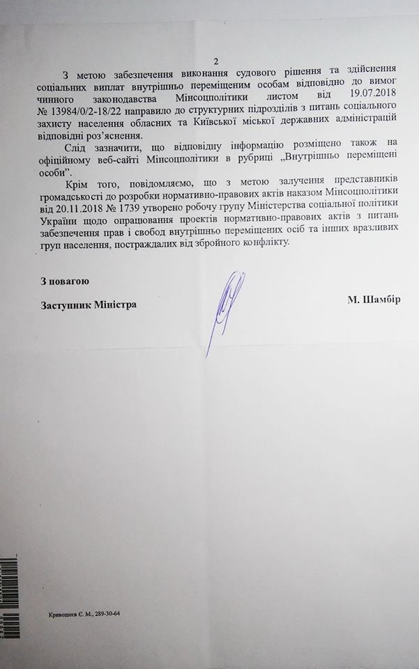 Министерство социальной политики Украины рассказало общественной организации "Громадський комітет захисту конституційних прав та свобод громадян" о проверках внутренне перемещенных лиц.