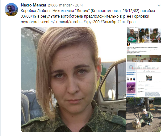 Так, по данным блогера Necro Mancer, Коробка Любовь Николаевна 1982 года рождения погибла в результате артобстрела предположительно под Горловкой 3 марта 2019 г.