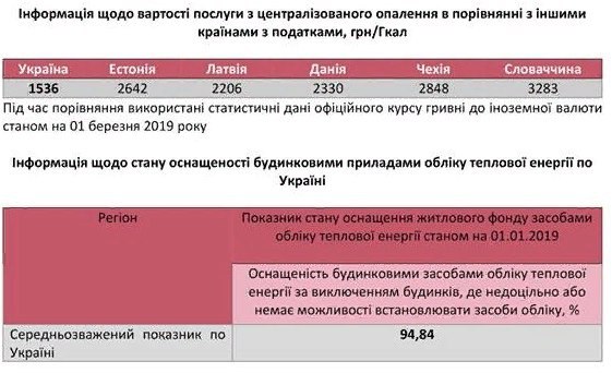 Жителям Украины эта услуга обходилась в 1536 грн/Гкал, тогда как в Словакии – 3283 грн, Чехии – 2848 грн, Эстонии – 2642 грн, Дании – 2330 грн, Латвии – 2206 грн (в эквиваленте по курсу НБУ на 1 марта 2019 года).