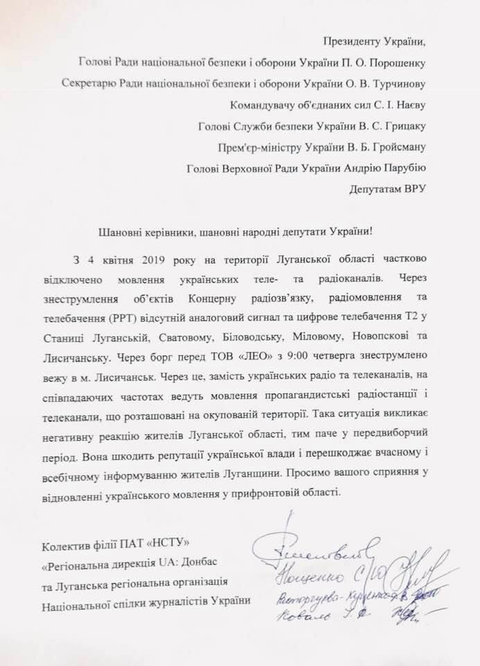 Телеканал "UA: Донбасс" совместно с Национальным союзом журналистов Украины обратился к представителям центральной власти для помощи в возобновлении украинского теле и радиовещания в Луганской области. Об этом на своей странице в Фейсбуке сообщил менеджер телеканала Андрей Шаповалов.
