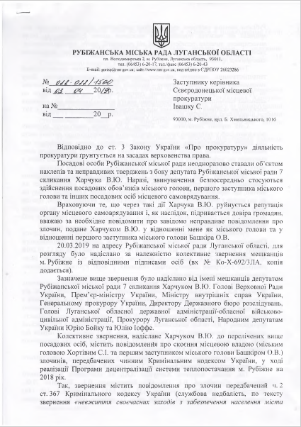 Городской голова Рубежного Сергей Хортив написал заявление в прокуратуру по поводу обращения депутата Валерия Харчука. Соответствующие документы появились в распоряжении редакции "Трибун".