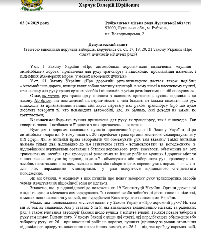 Депутат горсовета Валерий Харчук направил запрос городскому голове Сергею Хортиву и другим депутатам с требованием отменить решение Исполкома об установлении пешеходной зону на пр. Победителей.