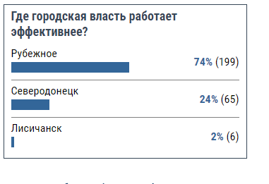 Так, 74% опрошенных (199 респондентов) считают, что лучше всего со своими обязанностями справляется Рубежанский горсовет, за ним идет Северодонецкий 24% (65 голосов). Хуже всего наши читатели оценили работу Лисичанского горсовета - 2% (6 голосов).