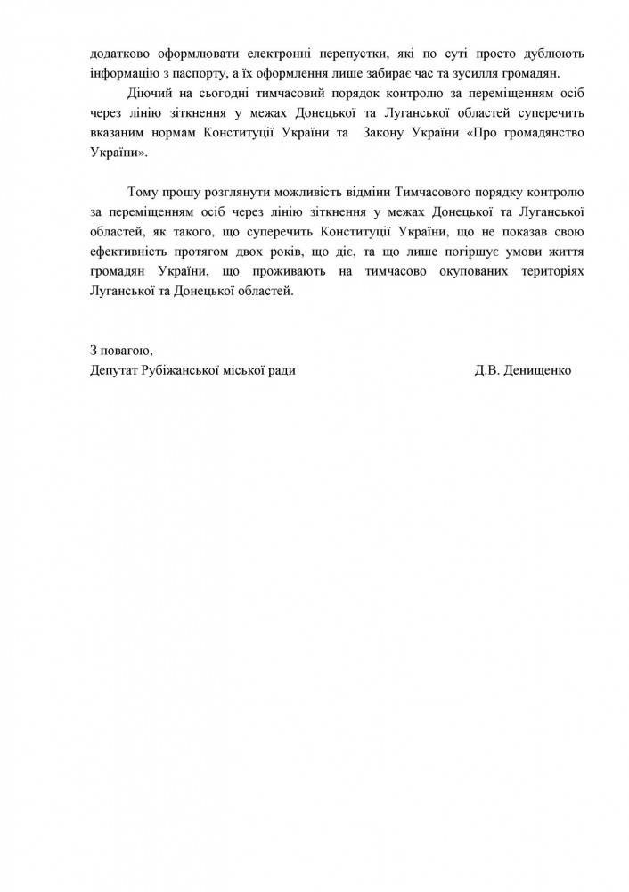 В своем обращении Денищенко рекомендует рассмотреть возможность отмены Временного порядка контроля за перемещением лиц через линию соприкосновения в пределах Донецкой и Луганской областей, "как противоречащего Конституции Украины, который не показал свою эффективность в течение двух лет действования, и который только ухудшает условия жизни граждан Украины, проживающих на временно оккупированных территориях Луганской и Донецкой областей".