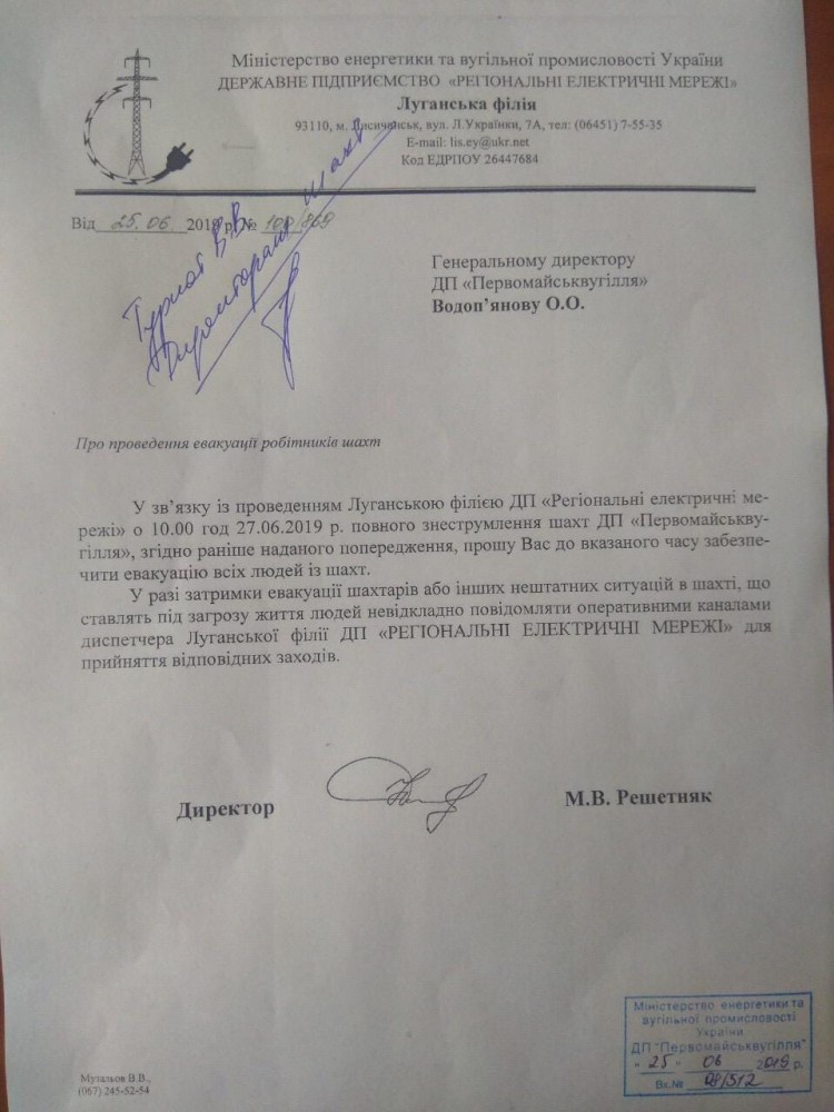 Структурний підрозділ міністерства ДП "Регіональні електричні мережі" розіслало по шахтам повідомлення про те, що завтра 27.06.19р. вугільні підприємства будуть знеструмленні. Закликали до негайної авкуації робочих.