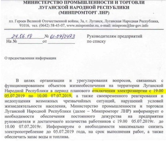 Уважаемые граждане, всем во внимание, с 19:00 5 июля до 10:00 7 июля в связи с проведением плановых ремонтных работ на высоковольтной линии 500 кВ “Шахты-Победа” и на другом высоковольтном оборудовании, по всей территории ЛНР будет отключена электроэнергия.