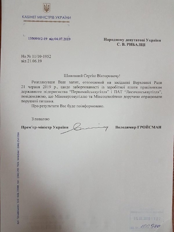 Премьер-министр Украины В.Гройсман дал поручения Министерству энергетики и угольной промышленности, а также Министерству социальной политики разобраться с проблемой задолженности по заработной плате на предприятиях «Лисичанскуголь» и «Первомайскуголь». Вопрос поставлен на контроль после депутатского запроса Сергея Рыбалки.