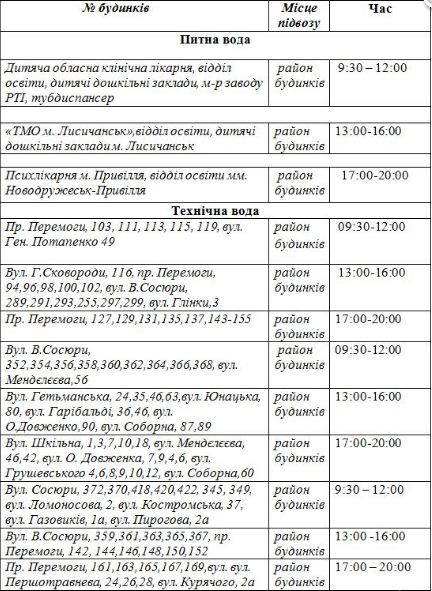Для оперативного решения вопроса обеспечения питьевой водой объектов социальной сферы и населения водоканал совместно с Главным управлением ГСЧС в Луганской области разработан график подвоза питьевой и технической воды.
