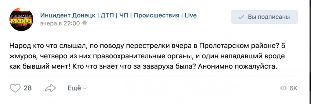 В Пролетарском районе оккупированного Донецка произошла перестрелка, в результате которой по неподтвержденным данным погибли пять человек.