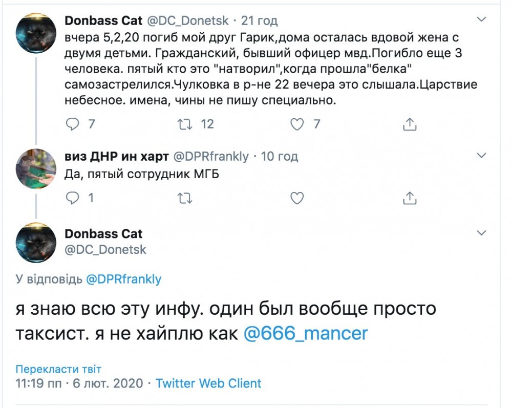 "В соцсетях пишут, что в Донецке на Чулковке вчера по пьяни боевик ДНР застрелил своих знакомых и застрелился сам. Пять трупов. Официальной инфы, скорее всего, не будет, как обычно, замнут". - написал Казанский.