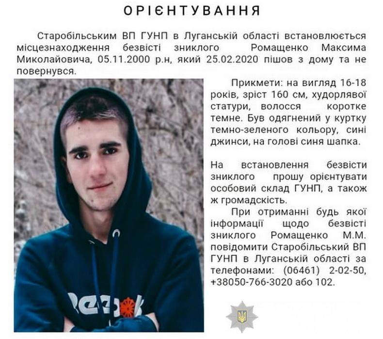 В поисках Ромащенко Максима, который еще 25 февраля 2020 года ушел из дома в с. Подгоровка и не вернулся, круглосуточно задействованы более 80 сотрудников полиции и Нацгвардии. Об этом сообщает Отдел коммуникации полиции Луганской области.