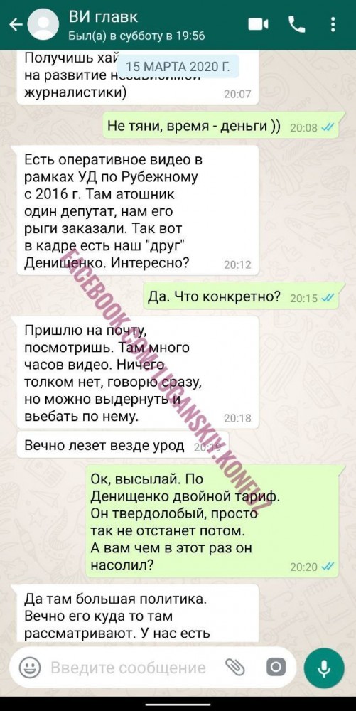 Наши кибер-друзья неплохо поработали и раздобыли переписку с WhatsApp Шевчука. Из нее видно, как блогер обсуждает с неустановленным лицом, предположительно имеющим отношение к силовым структурам, мероприятие по дискредитации чиновника Луганской ОГА Дениса Денищенко. Обратите внимание, что переписка датирована 15 марта, а стрим Шевчука вышел в 18:46 20 марта.