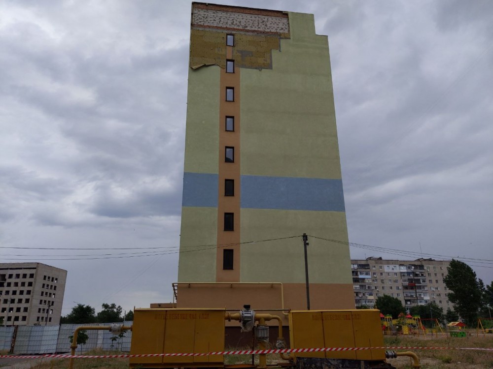 Недостроенный дом для переселенцев в Рубежном получил повреждения из-за сильного ветра, который накрыл город накануне в воскресенье, 21 июня.